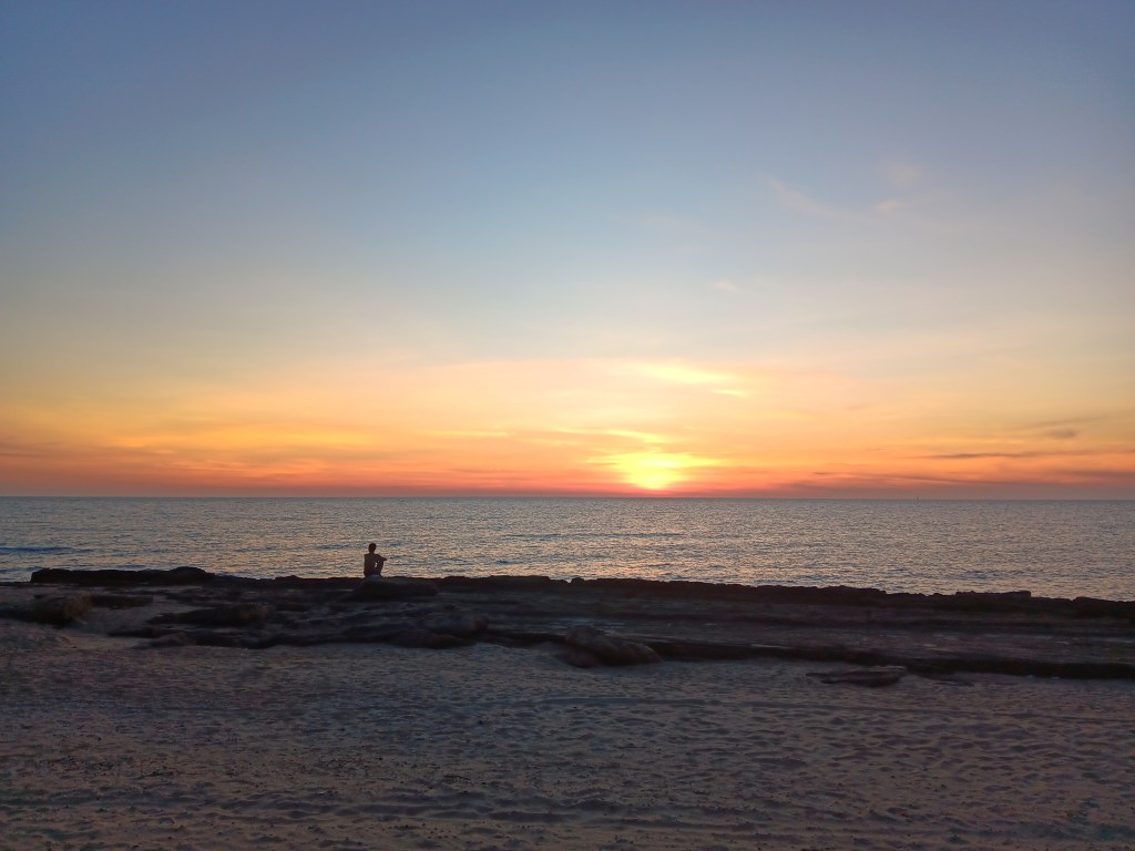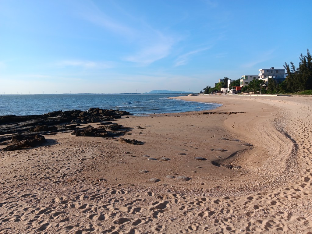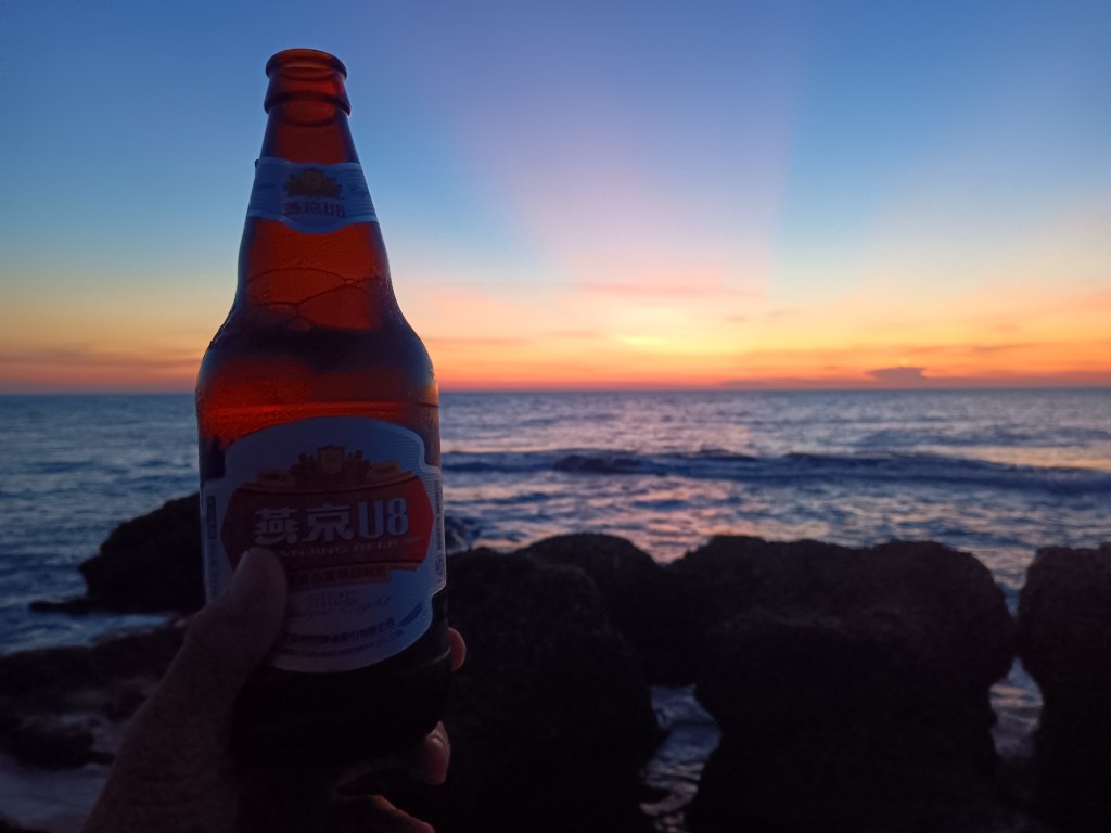 As I walk back along the beach, a Yanjing beer from the now-bustling convenience store in hand, the last rays of the sun unfold and expand like a giant pink fan above the coal tankers floating on the horizon, waiting for their turn at the port. The sun disappears somewhere over there, across the water and then, somewhere beyond it, Vietnam.