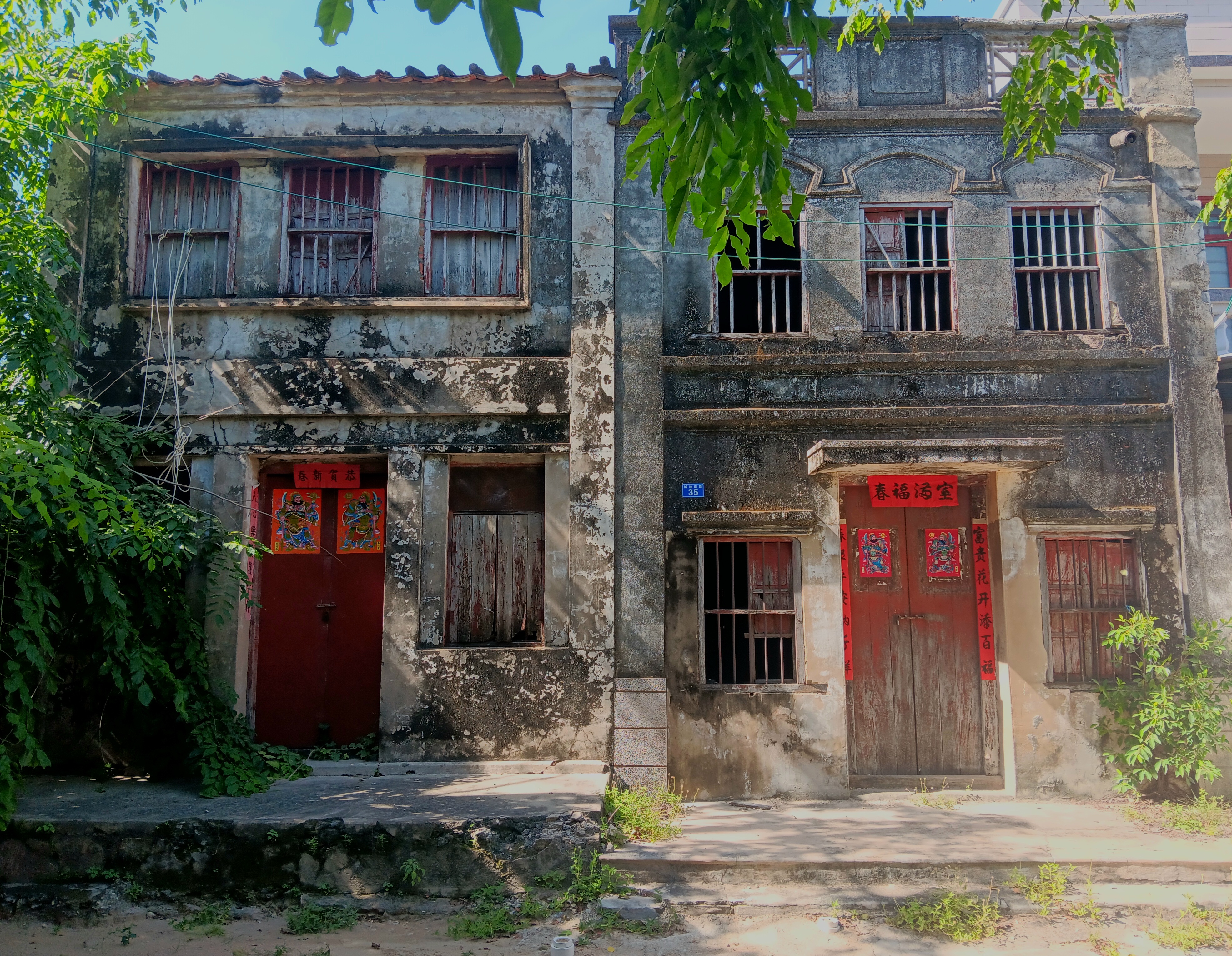 Whether the house is one of the old ones –mortared stone and brick with peeling wooden doors, glassless windows, and dirt floors, the second stories often long-abandoned — or whether it is one of the new ones — two or three levels of gleaming porcelain tile and metal railings, doors solid and windows sealed — the TVs are the same, and they are ubiquitous. As ubiquitous the posters of the door god plastered onto the entryways, new and old alike. As ubiquitous as the ancestral shrines, the centerpiece peaking through each open door, portraits of now-gone relatives framed by electric red candles and set on mantles below giant calligraphic representations of the character for spirits, 神.