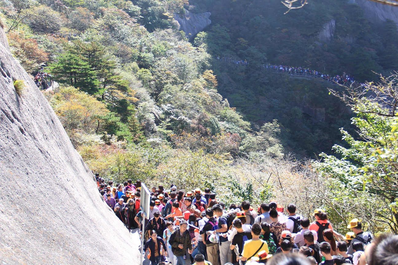 At one junction approaching my planned decent-route, after jamming myself into the crowd China-style, I stood without moving for nearly 10 minutes in the then-baking sun as I stared aghast at the red-and-yellow-capped snake of tour groups that coiled around the mountain past what appeared to be a man-carried chair that had fallen off the mountain side, and then coiled around again out of sight.