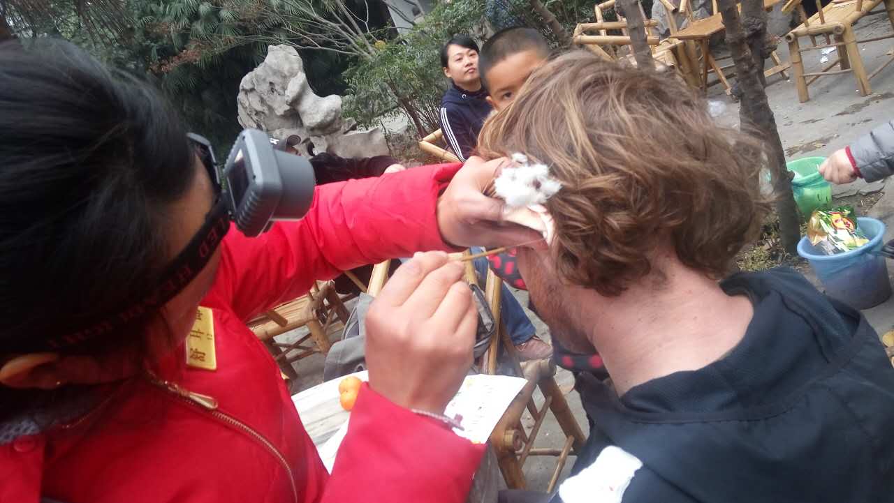 Armed with a headlamp, some cotton balls, and a set of hooked implements that look they belong in a dentists office or a torture chamber, ear cleaners roam Chengdu’s park-located tea houses plying their traditional trade. For about 50 yuan, they’ll jam those implements in your ears, scrape them clean, and even give them a good vibration with that tuning fork that also serves as their audible advertisement and calling card. It takes about 10 minutes for both ears.